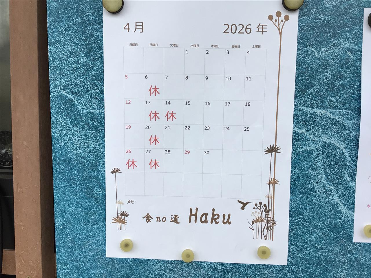 お知らせ news 2026/04/01 四月の営業日 2026/03/01 3月の営業日 2026/02/04 2月の営業日 read more Hakuについて about read more メニュー menu read more ギャラリー gallery read more よくあるご質問 faq 営業時間は何時から何時までですか? A. 食no道Hakuは、17:00~23:00(最終ご入店22:00)まで営業となります。 定休日は月曜日となっております。お電話でのお問い合わせも上記の時間にて受け付けております。 どうやって予約すればよいですか? A. お電話でご予約ください。 ▼ご予約はこちらTEL:072-744-5391 お支払い方法はカードでも大丈夫ですか? A. 各社クレジットカードの使用が可能です。但し、一括払いのみとなります。 ※電子マネーに関しましては、現状「PAYPAY」のみが使用可能でございます。 read more